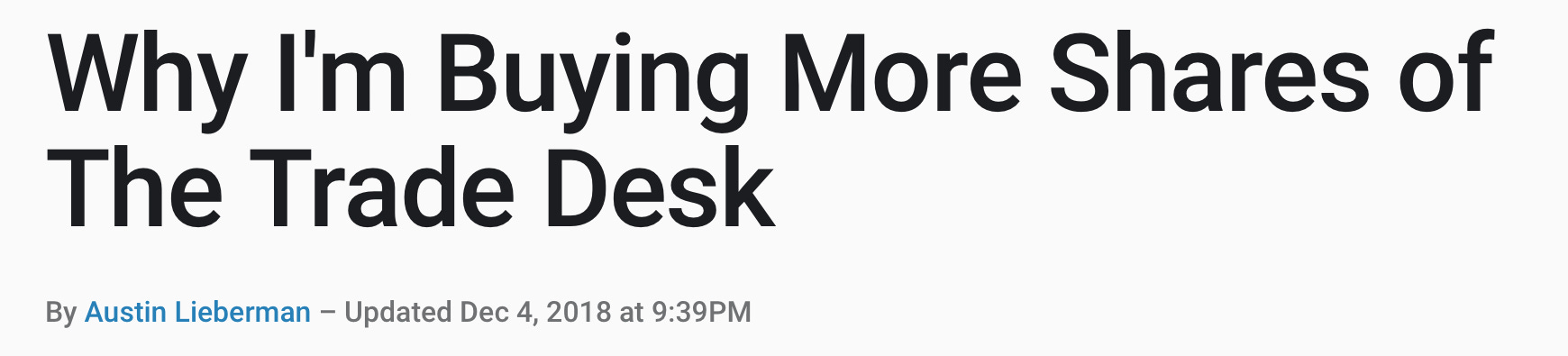 Two investments that represent my approach were buying Shopify in 2017 (Up 891%) and The Trade Desk in 2018 (+334%).