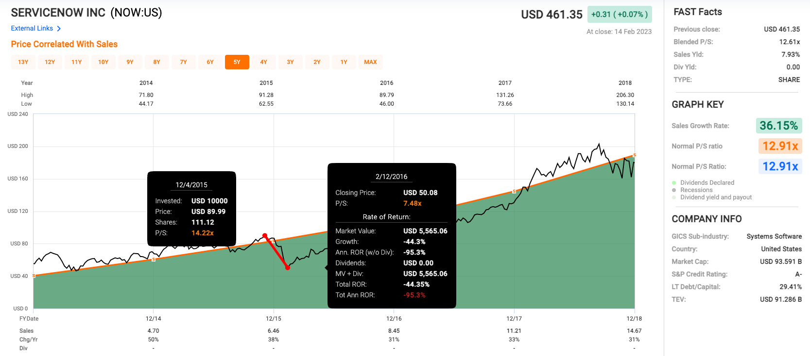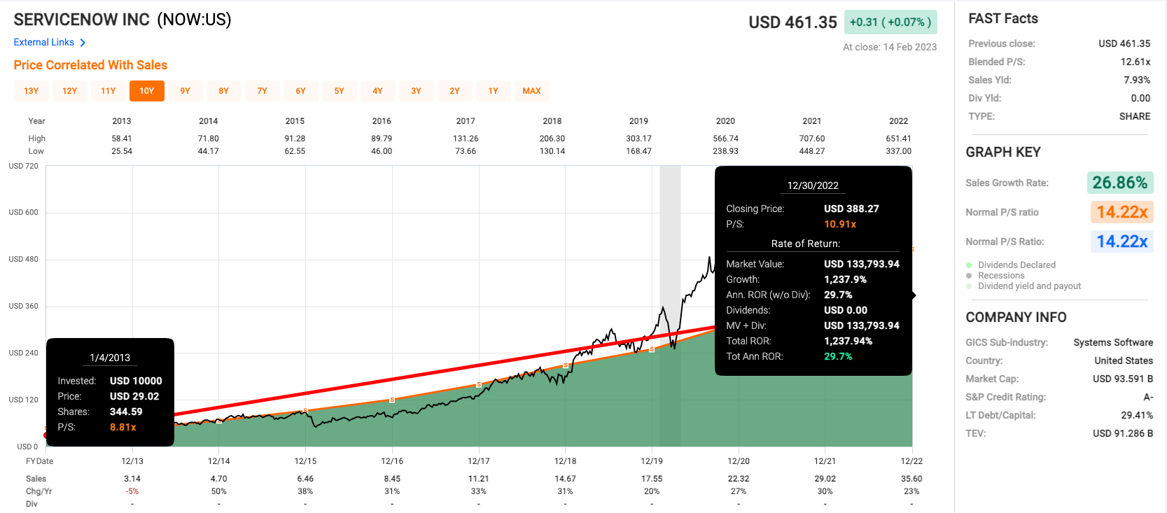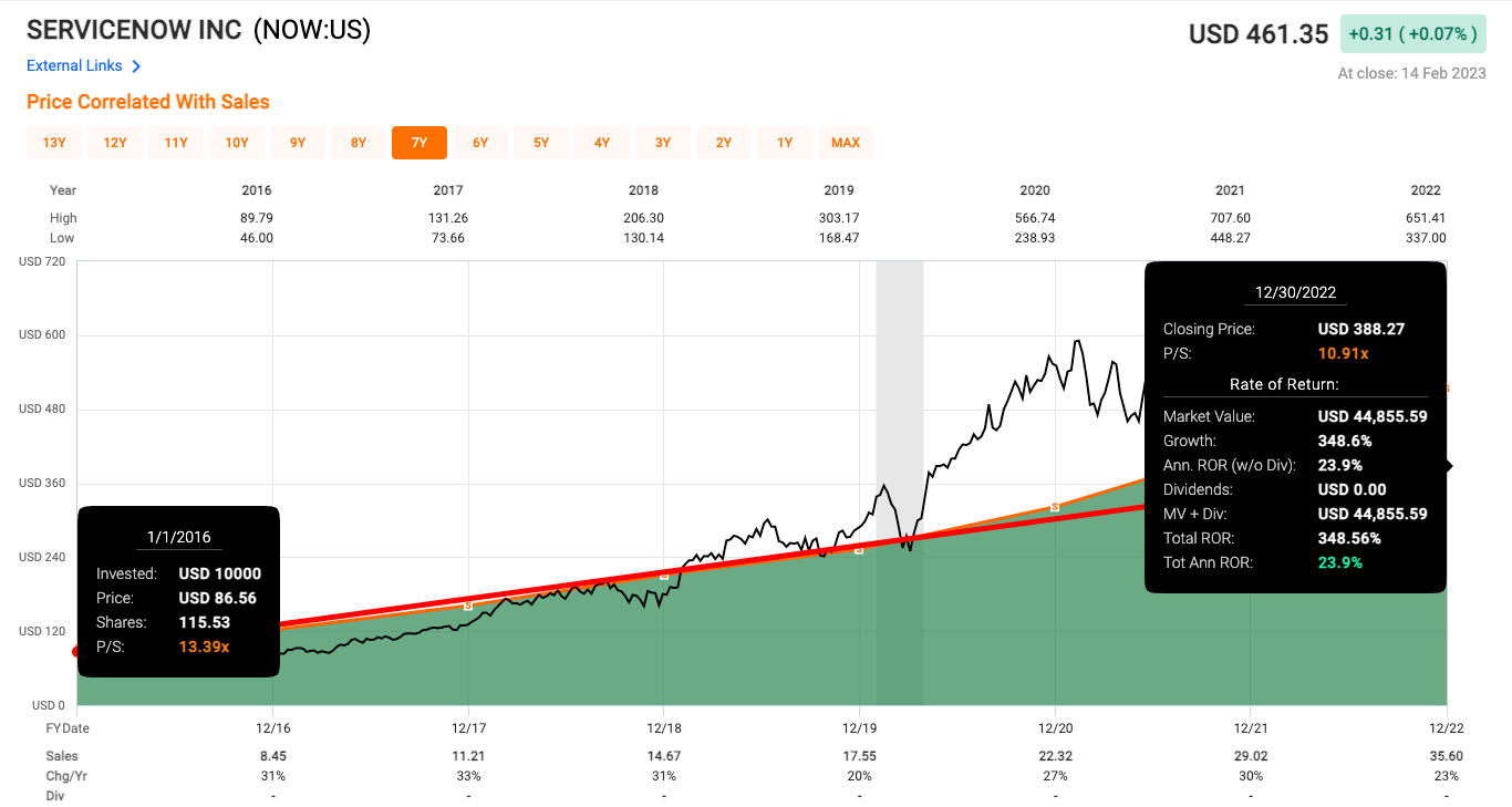 If you would have owned NOW 0.00%↑ from when it had a P/S of 13 in 2016 until the end of 2022 you would have earned a total return of 348%... roughly 4.5x your initial investment.