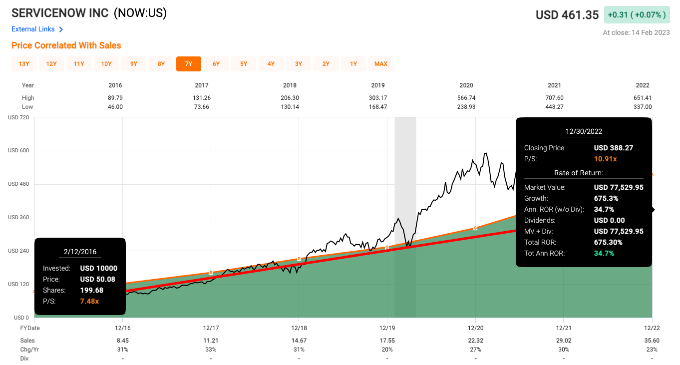 If you waited and bought when NOW 0.00%↑ was at a more reasonable 7.5x P/S and held until the end of 2022, you would have earned a total return of 675% or almost 8x your initial investment.