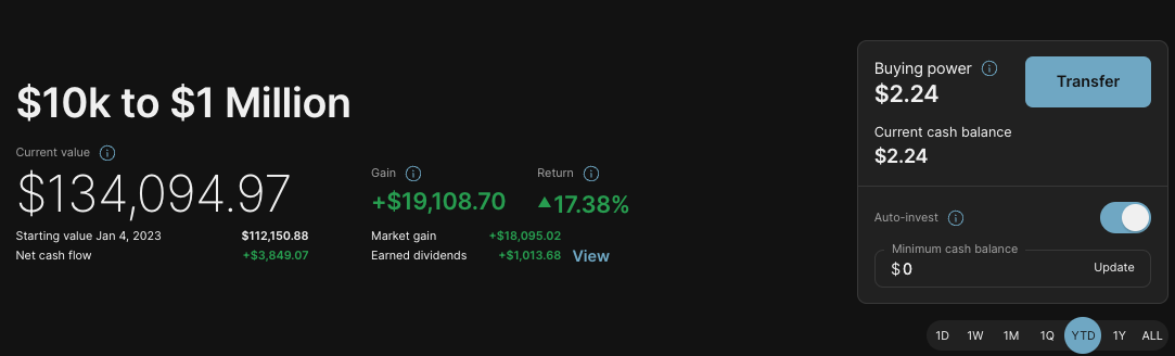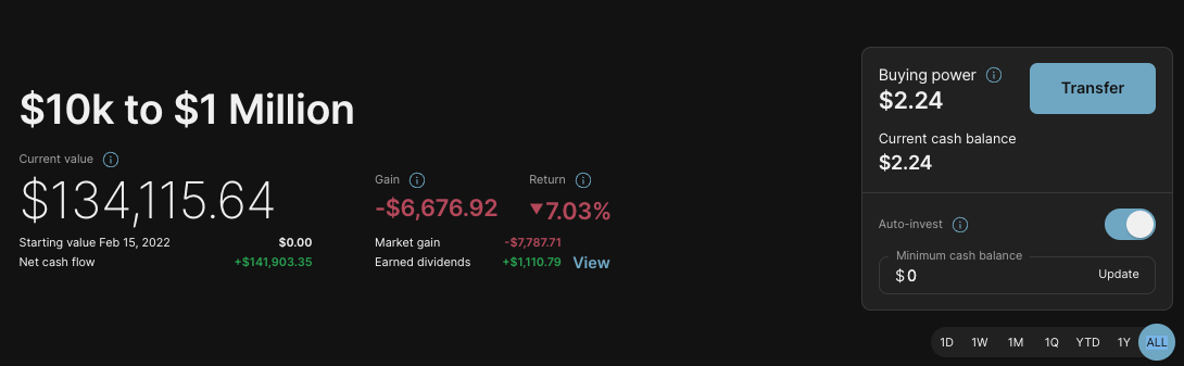We’re still up 17.4% YTD and down 7% since starting the portfolio on Feb 15, 2022.