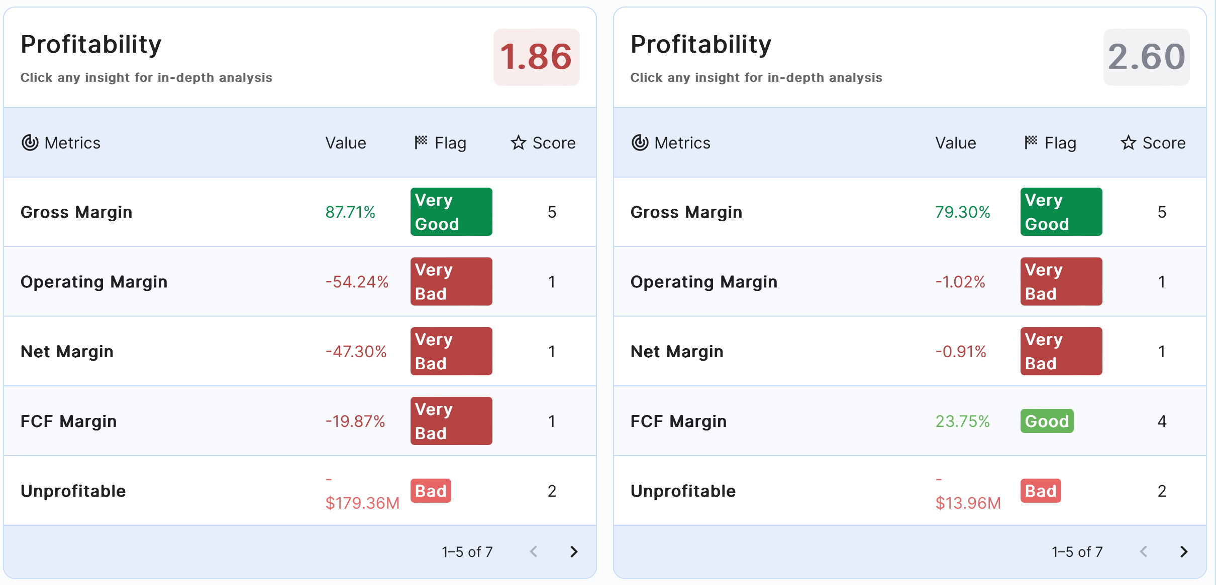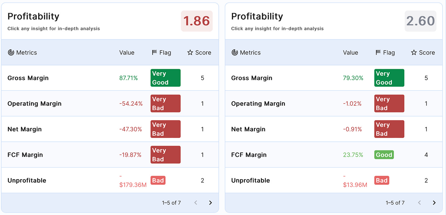 Let’s take GTLB vs DDOG. The left side below is GTLB and the right side is DDOG. GTLB is growing slightly slower and is far less profitable than Datadog.