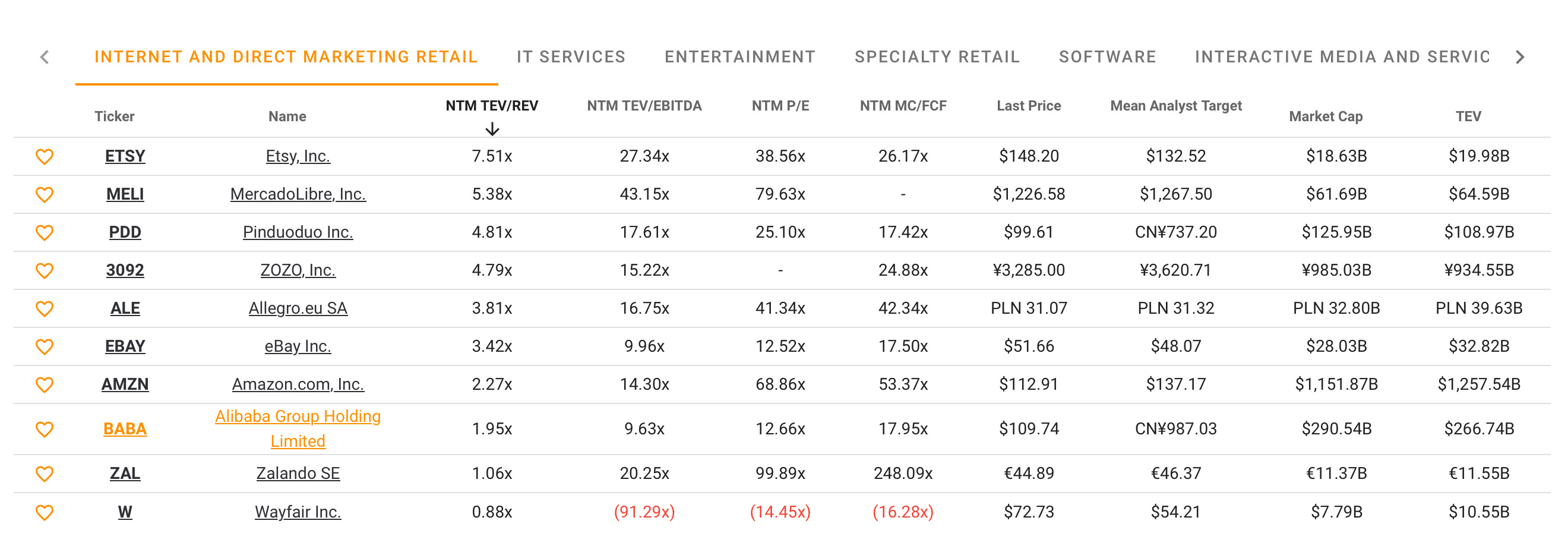 Here’s a list of BABA vs its “peers” from TIKR.com. BABA currently trades at a next-twelve month enterprise value to revenue ratio of 1.95 and a next twelve month market cap to free cash flow ratio of 17.95 vs 2.27 and 53 from Amazon and 7.51 and 26 from ETSY.