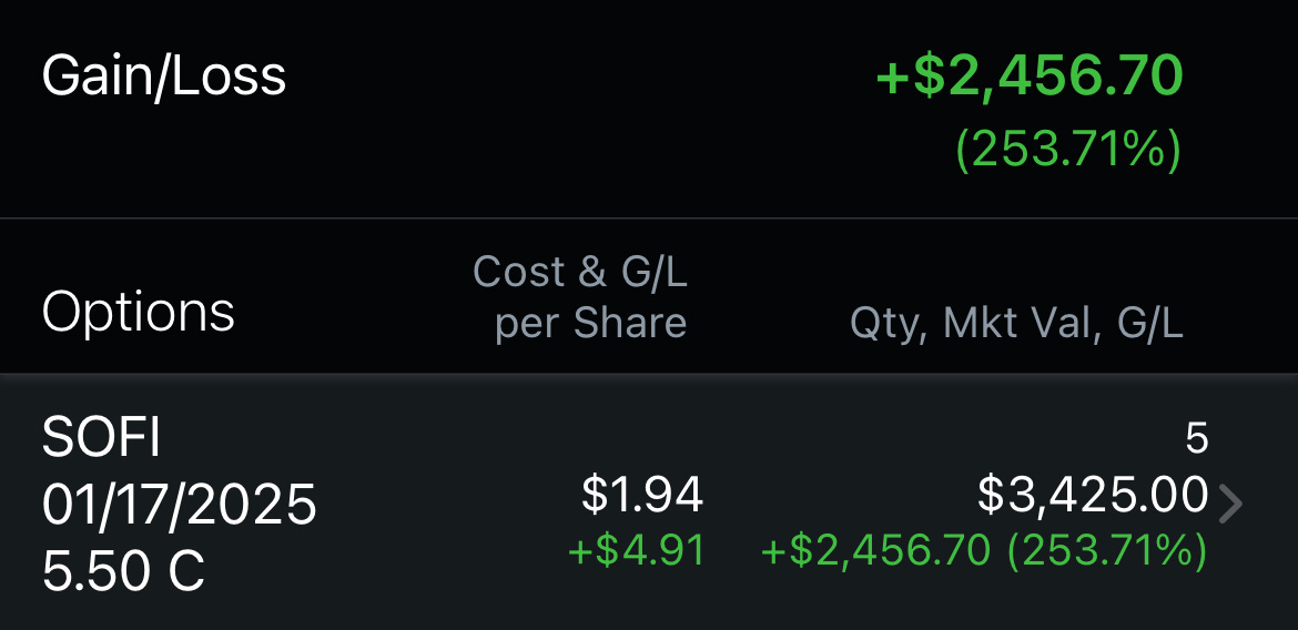 I own 5 x SOFI $5.5 strike, January 17, 2025 expiration calls that I bought for $1.94 each. The calls cost me a total of roughly $1,000 and on 1/17/2025 if shares of SOFI are under $5.50 I lose my $1,000 investment. If shares are above $7.44 (the $5.5 strike + the $1.94 premium I paid), I make money. I’ll make $500 for every $1 over $7.44 shares trade at on expiration because I own five calls.