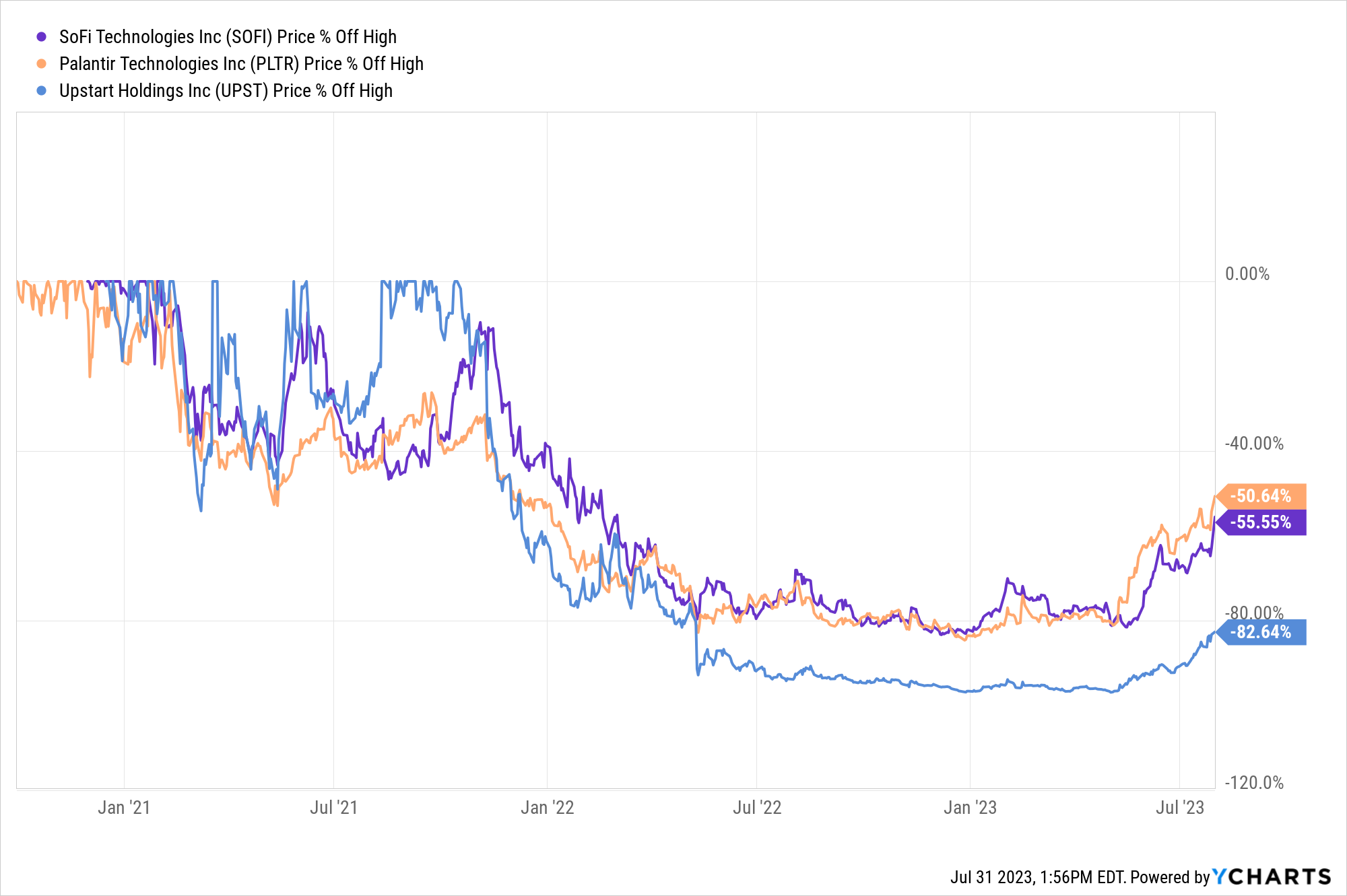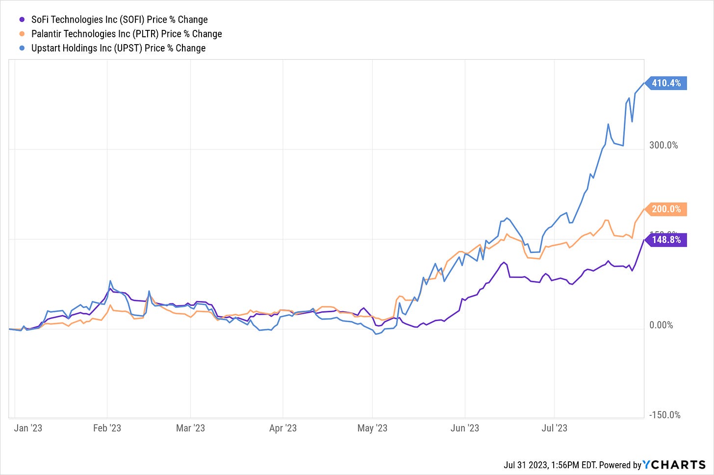 First, I want to point out that even after 150%, 200%, and 410% YTD gains, SOFI, PLTR, and UPST are still down 55%, 51%, and 83% from their 2021 highs. Perspective matters.