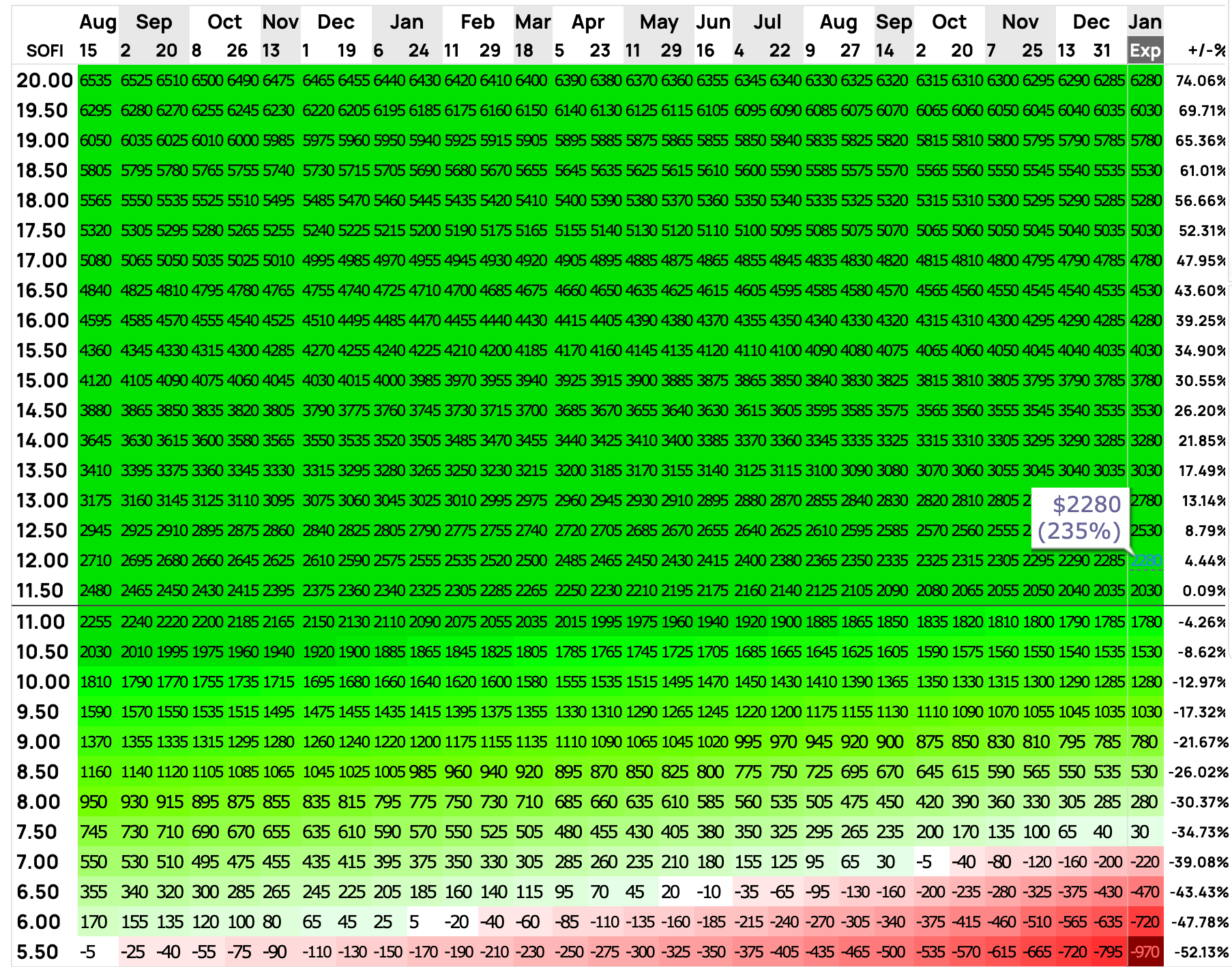 The following chart is a bit of an eye-sore, but it shows how much profit/loss I’d have at different share prices/dates. About halfway up on the right side, you’ll see $2,280 profit. That shows that to make roughly the profit I have now at expiration in January 2025, I’d need shares to trade at $12.00.
