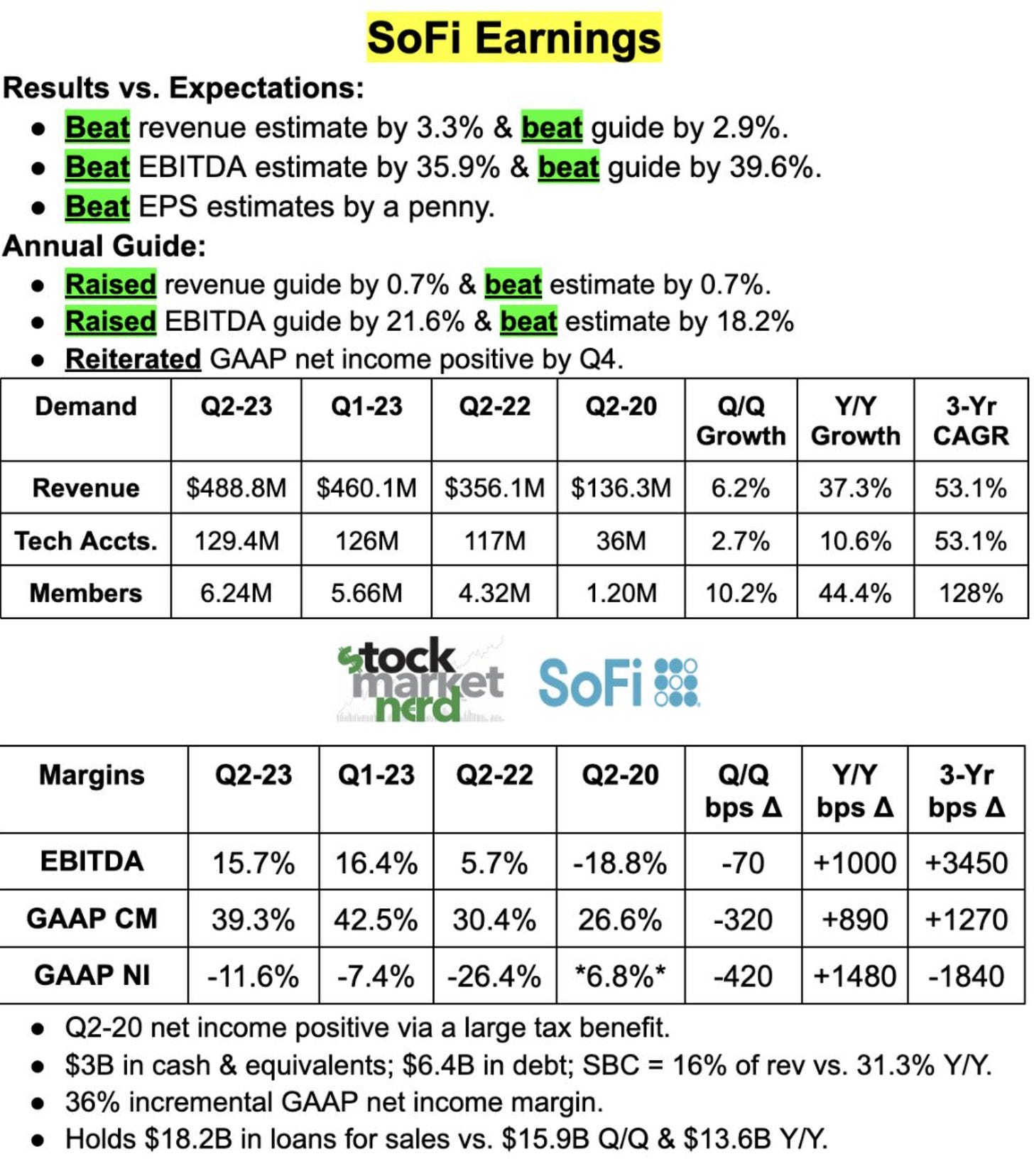 does a great job with his earnings snap shots so I’m sharing his SOFI snapshot below. The quarter was a beat all around with guidance that also beat analyst expectations.Notes from the company press release