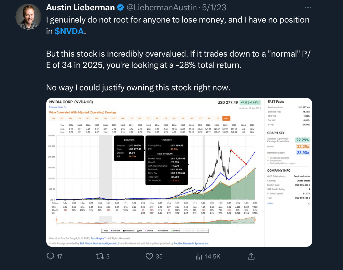 Shares are currently trading at $423, up 191% since that tweet. But I’m still sitting on the sidelines.