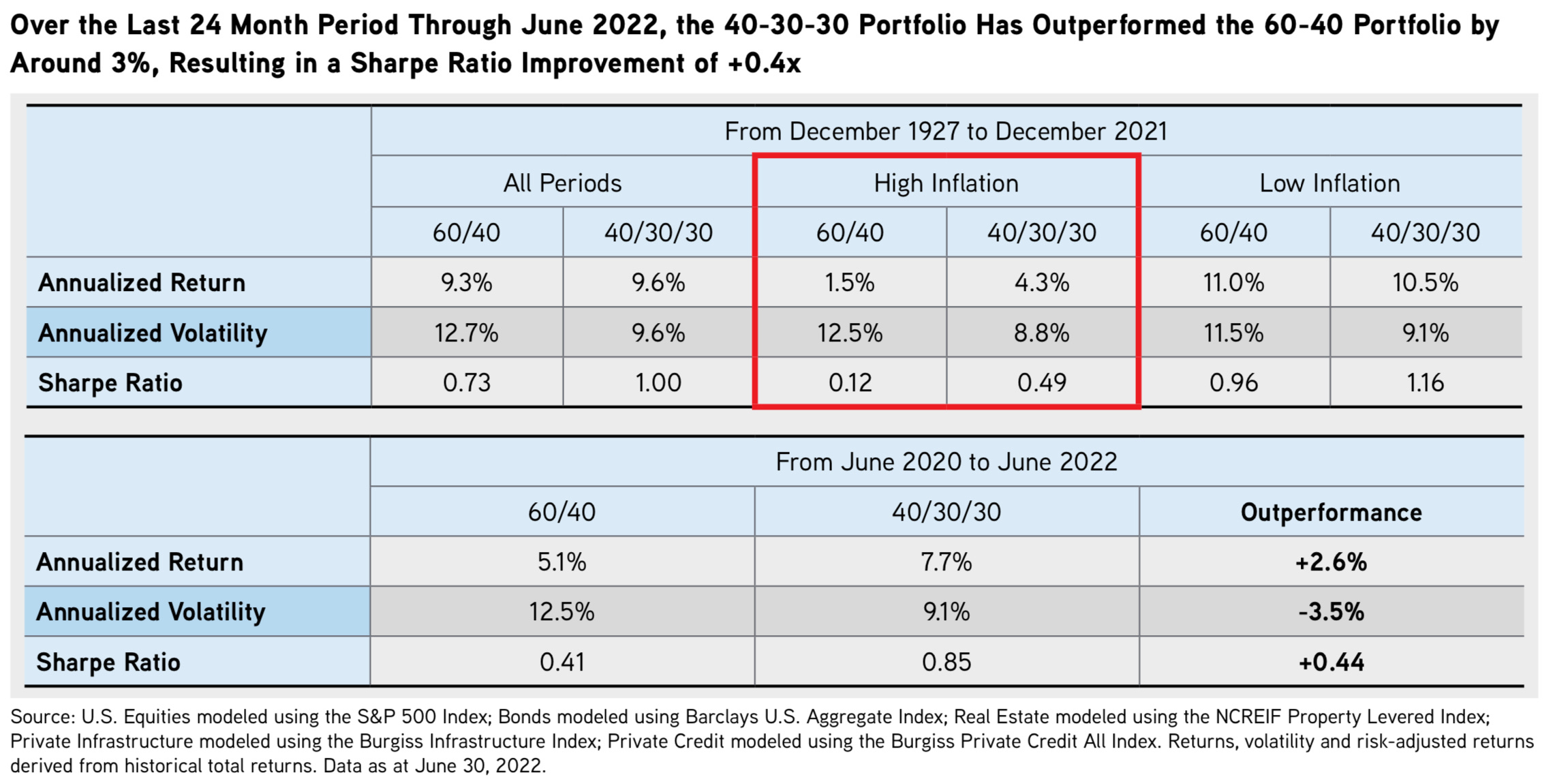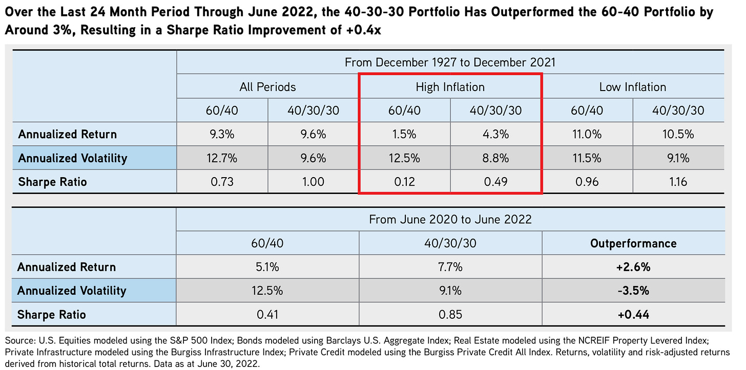 A study from investment giant KKR explored the benefits of adding alternative investments into the mix over almost a century of returns. Their findings? The 40/30/30 portfolio, which adds real estate, infrastructure and private credit assets into the holdings, offered higher returns — with lower volatility — during periods of high inflation.